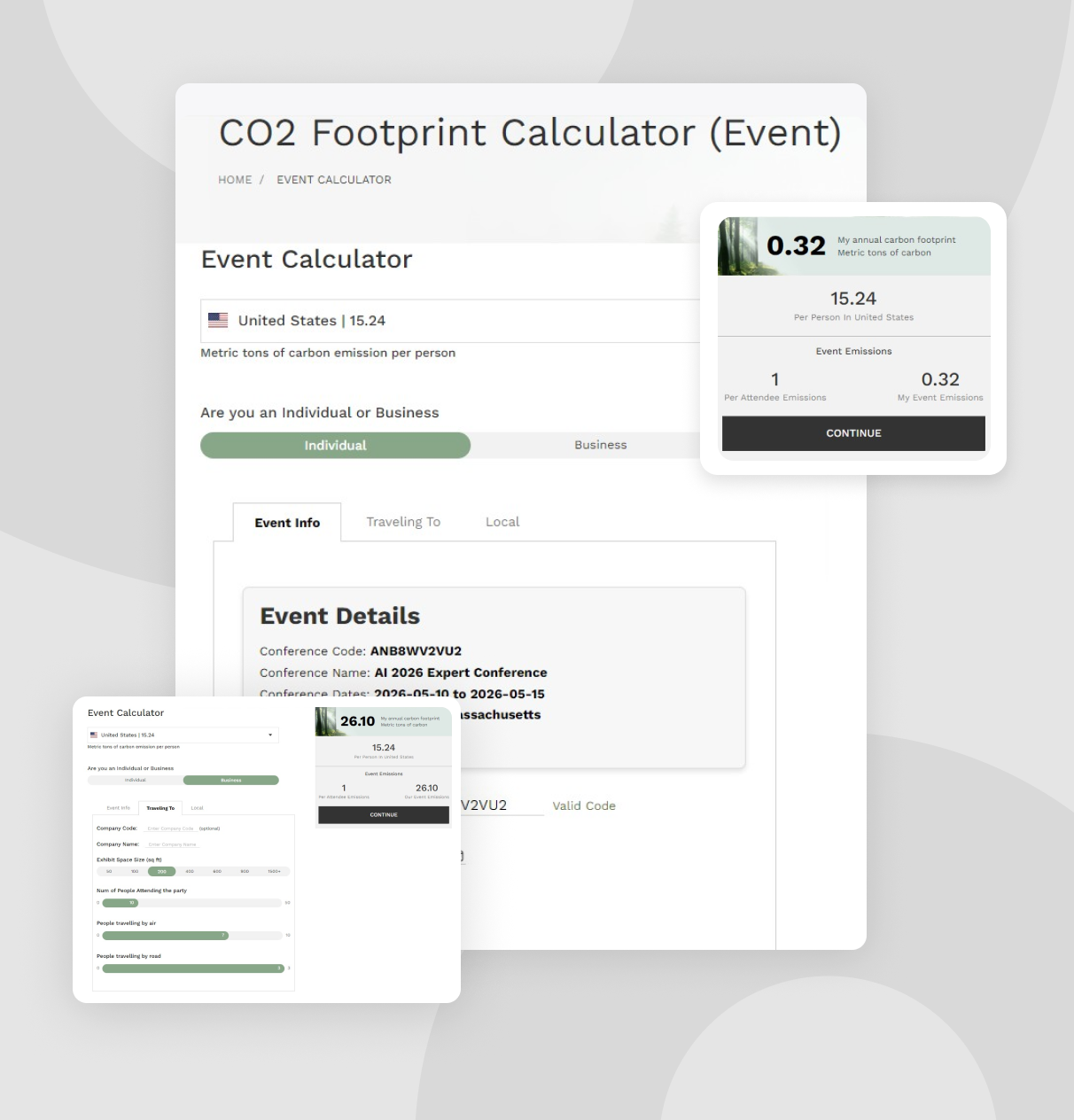 Make your conference carbon-conscious. Empower your attendees to calculate, reduce, and offset their carbon footprint—turning every event into a catalyst for climate action.